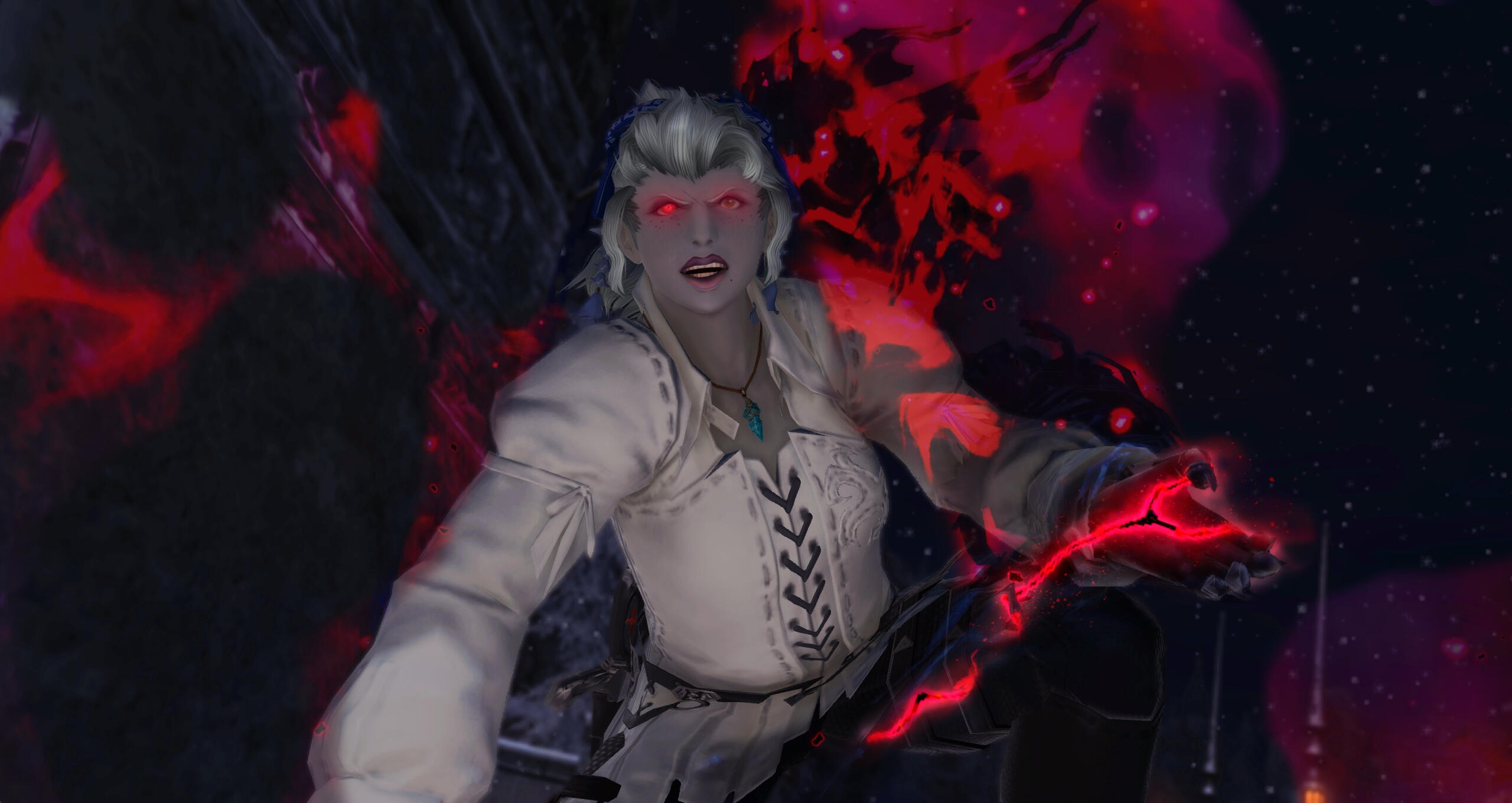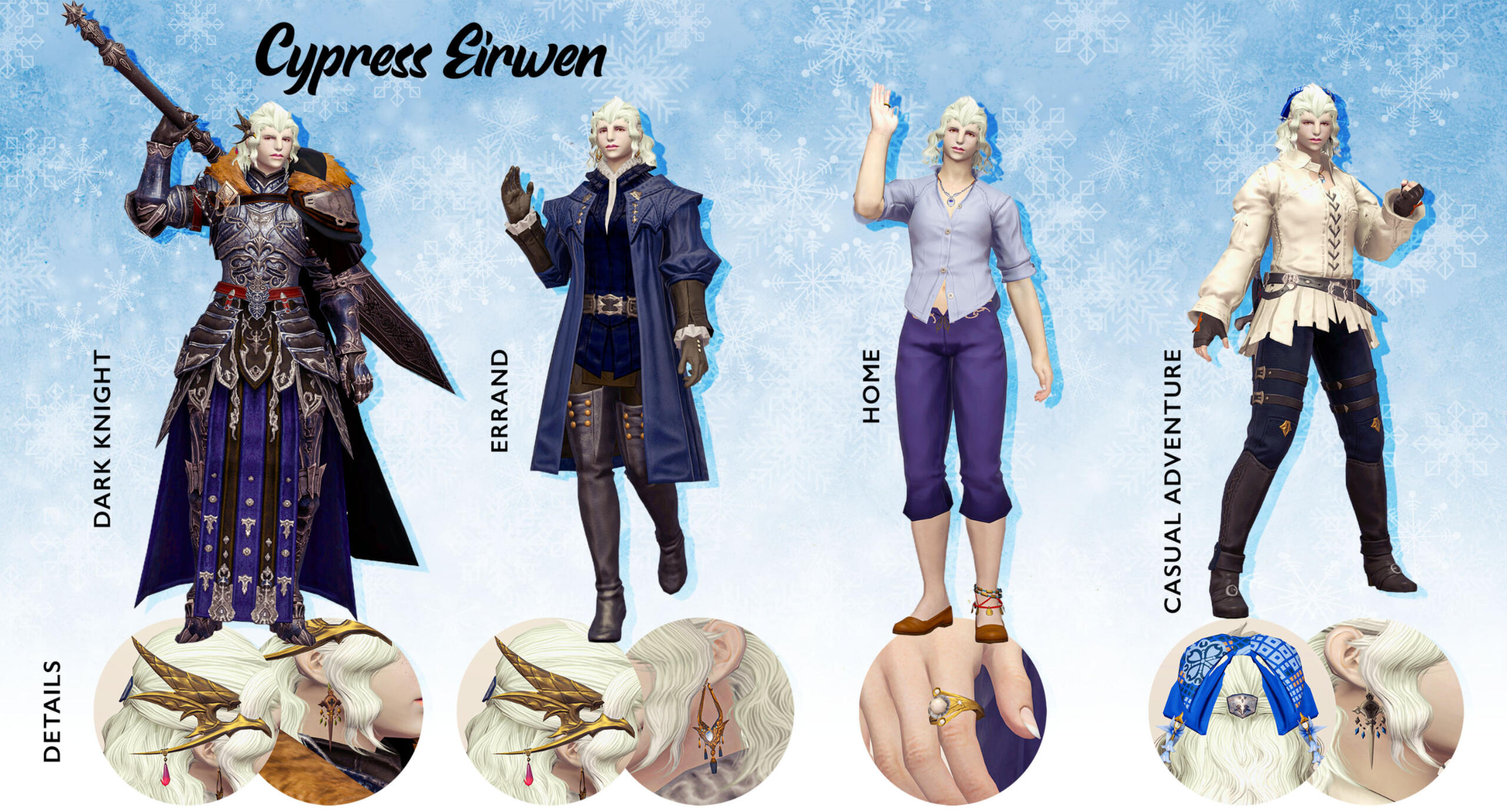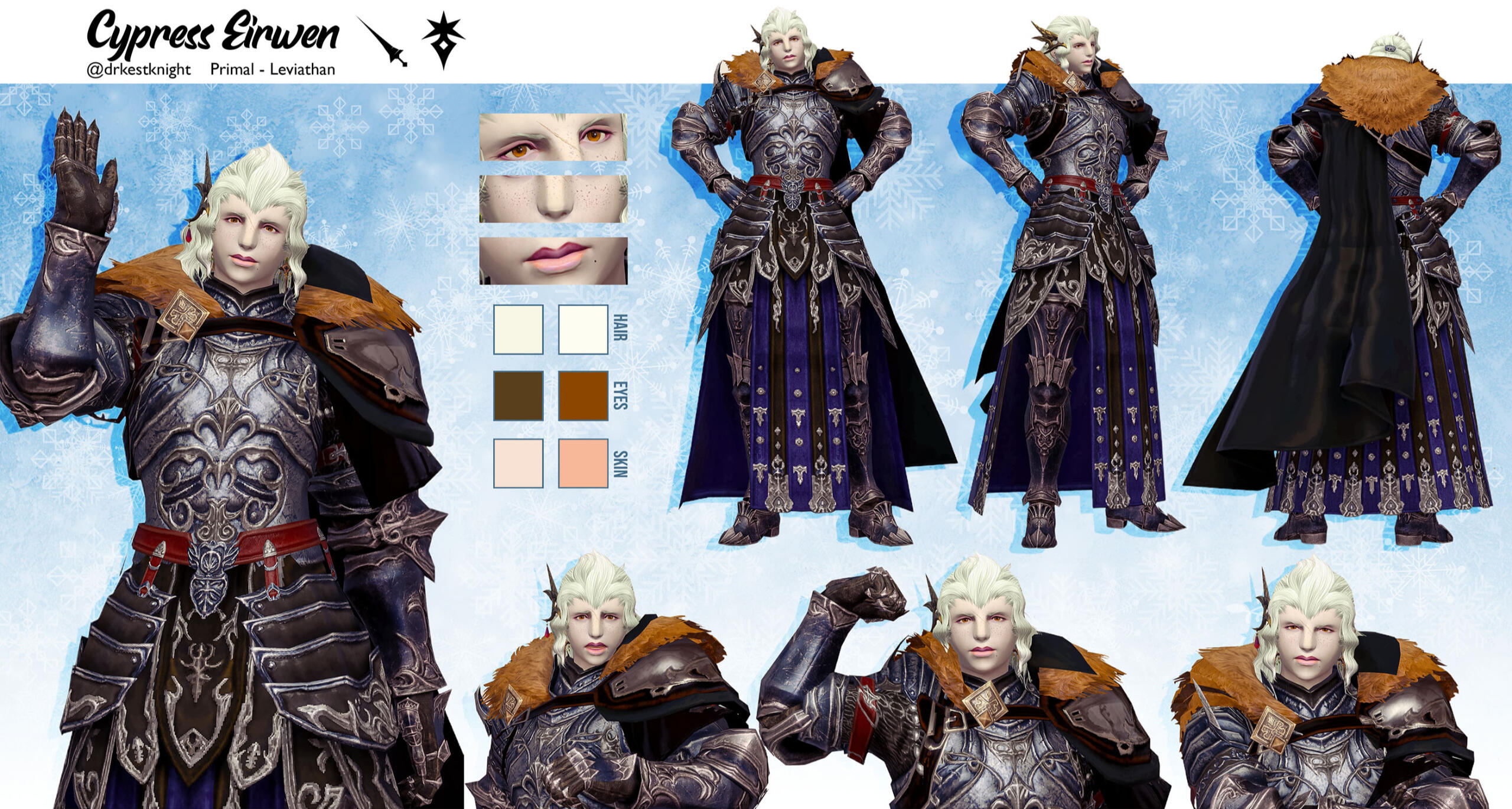 Cypress was born as "Gentle Tide" to roegadyn couple Roaring Wave and Silver Lake, the two of which served the Dzamael household in Ishgard. A shipwreck in her youth left her orphaned and scarred on the coast of Cedarwood, where she was rescued and adopted by a local hyruan couple. The trauma left Cypress bedridden and unable to speak, and in absence of her being able to provide her name, they renamed her “Cypress Eirwen” to address her as she recovered. By the time Cypress finally began to speak again, she decided to keep the name. A necklace she was washed ashore with became the only physical reminder of her birth family that she kept.A few years before the 7th Umbral Calamity, Cypress left her village for the first time at the age of 18. She made her way earning coin through odd jobs and crafting goods until she came to Limsa Lominsa, taking up the lancer's art and joining the Adventurer's Guild. It was through the Guild that she met the people who would come to make up her adventuring party; the extroverted conjurer Chachamu Chamu, the flirty archer I'shira Tia, and the compassionate knight she would come to consider her brother, Cygne Benoit.The party soon grew close and maintained a steady stream of jobs, eventually making enough coin to travel beyond La Noscea to the lands of The Black Shroud. It was there that, tragically, Cygne met his end. In a rush to protect Cypress, his shield broke under the strength of the fatal blow. Numb and unable to deal with her grief, Cypress sought comfort from I’shira before fleeing the morning after, afraid of someone else she loved getting hurt for her. Now on her own, she resolved to travel to Ishgard; to return Cygne’s shield to his family so he could rest in peace.Upon arriving in Ishgard, Cypress was recognized as "Gentle Tide" and allowed through the gates. Her birth family's service to the Dzamael household helped her gain footing to establish herself as a lance for hire in The Brume and familiarize herself with the city. As she sought to achieve her mission to return her adventuring partner’s shield, she found, to her horror, that Cygne’s family refused to grieve for him. Through pretty gossip she discovered Cygne was considered a heretic by his minor noble family – exiled after his cowardice cost his unit their lives. To make matters worse, a closer inspection of the shield one night revealed to Cypress that it had been purposely tampered with. Cygne’s death was by design.Desperate for answers, Cypress accepted a lead from a mysterious stranger, only to be drugged and overpowered in the Brume. In her panic, a burst of dark energy from within saved her life but overcame her, leading her to chase her attacker across Ishgard before finally succumbing to unconsciousness…What happened that night and how she came to be safely in her inn room is a mystery Cypress has yet to solve. But now, brimming with new, terrible power, she has found new purpose in her grotesque rebirth; to avenge Cygne’s death and to cull Ishgard of other monsters who prowl in the night.